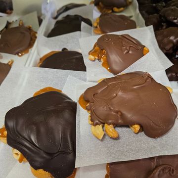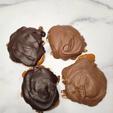 Pecans covered in creamy caramel and top with milk or dark chocolate. They are the size of your palm.