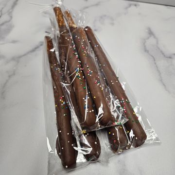 Pretzel rod dipped in milk or dark chocolate topped with sprinkles