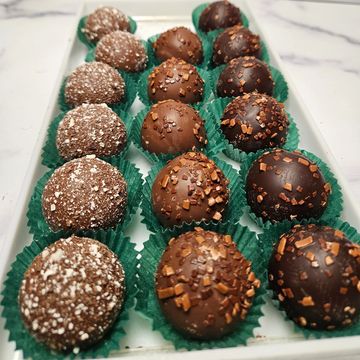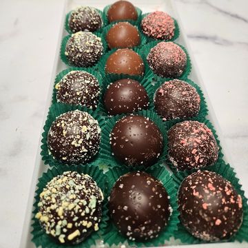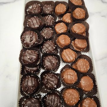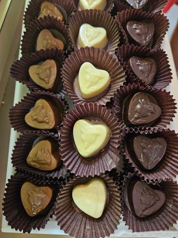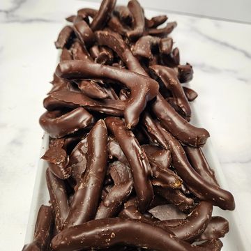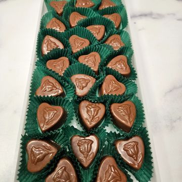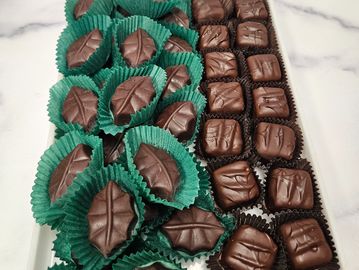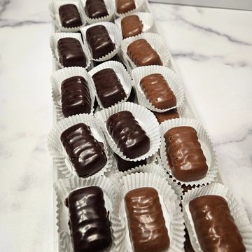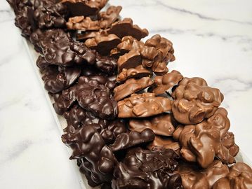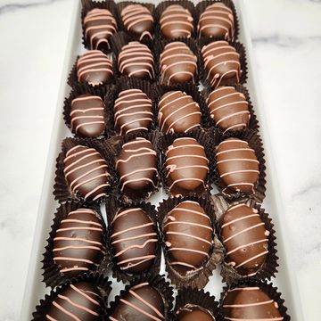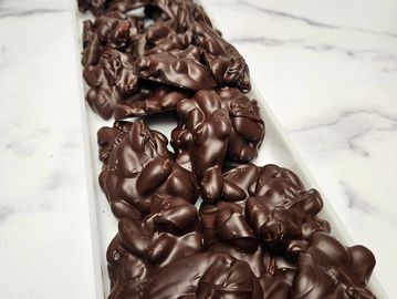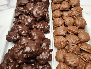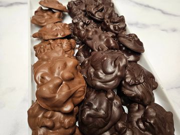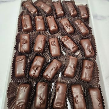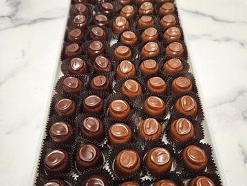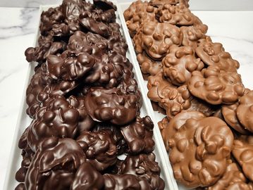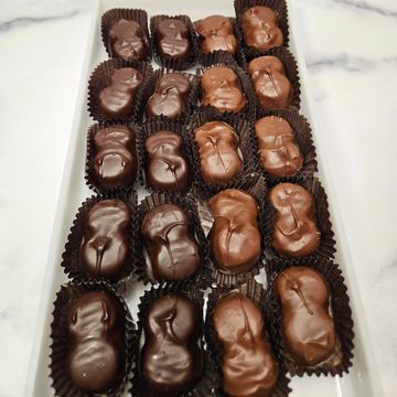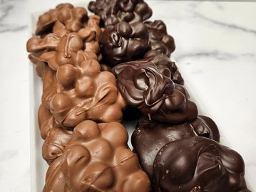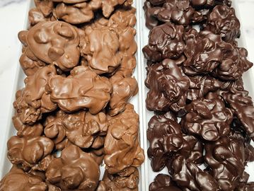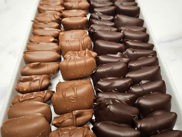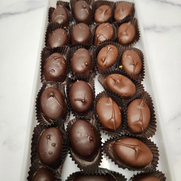 Pecans, covered in caramel and coated in chocolate. Available in Milk or Dark