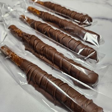 Chocolate layer, Caramel, then Chocolate pretzel rod