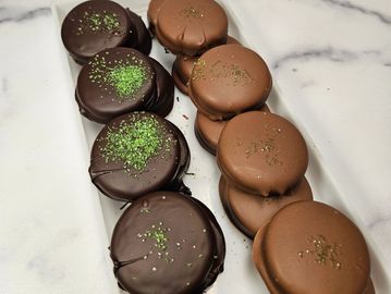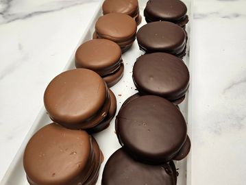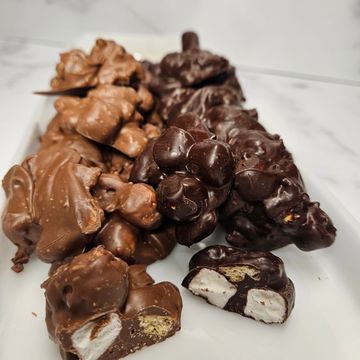 Graham crackers, mini marshmallows covered in chocolate. Available in Milk or Dark (seasonal, summer and fall)