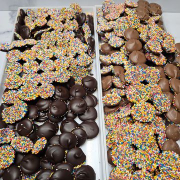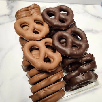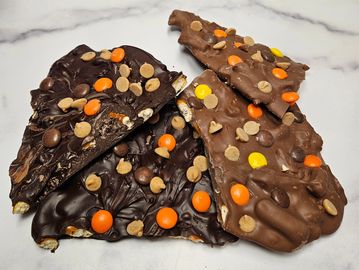 Pretzel pieces, covered in chocolate with Reese's pieces and peanut butter chips. Available in Milk or Dark
